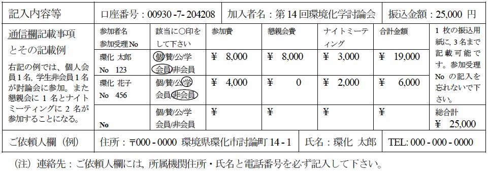◎事前支払いの方法:5月13日(金)までに機関誌(2005年3月号)挟み込みの郵便局振込用紙 (払込取扱表) または郵便局備え付けの振込用紙に,記入例に従って, 指定郵便局口座[第14回環境化学討論会, 口座番号:00930-7-204208]にお振込み下さい(振込手数料は各自ご負担下さい)。振込期限後の参加費の振込は, たとえ事前参加登録をされていても, 当日受付扱いになりますのでご注意下さい。