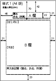- 記入事項:様式1のA欄には,題名,氏名,所属を記載して下さい(B欄の下部には英文で表記)。様式1のB欄と様式2のC欄には,目的,方法,結果,考察等を記載して下さい。また,様式2の右上のD欄には,ポスター発表の方は,[第16回環境化学討論会,登壇者氏名,ポスター発表(北九州;2007年)]の様に1行以内(フォントサイズを調整)で記載して下さい。口頭発表の方は,上記の[ ]内の「ポスター」を「口頭」に変えて同様に記載して下さい。英文で作成する方も,D欄内に[16th Symposium on Environmental Chemistry,Speaker's name,Oral presentation (Kitakyushu; 2006) ]の様に記載して下さい。上記下線部の登壇者氏名やSpeaker's nameとは,実際に,講演要旨の内容を発表・説明する人を指しています。