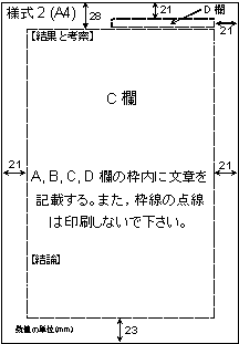 Microsoft Wordを用いて要旨作成を行う場合は,様式1および様式2のWord用テンプレート(Word2000で作成)をダウンロードして,上記の書式設定条件を確認後,作成・印刷して頂いても結構です。なお,お使いのWordのバージョンによっては,上記書式の見本とは余白等が異なることがありますので,この場合は適宜調整していただきますようお願いします。
