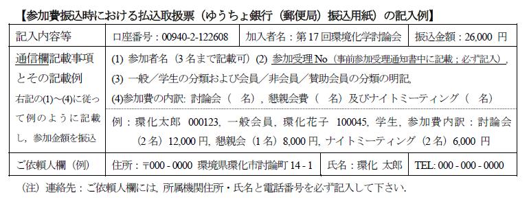 注) 上段は事前申し込み,下段は当日受付の金額です。懇親会あるいはナイトミーティングに参加するためには,討論会参加費を支払って頂く必要があります。懇親会あるいはナイトミーティングのみの参加は受付ません。また,懇親会費及び非会員の討論会参加費には,消費税が含まれています。なお事前参加申込に限り,賛助会員では3名まで,公益会員Aでは2名までが会員料金で参加出来ます。 ◎事前支払いの方法:5月16日(金)までに,機関誌3月号挟み込みのゆうちょ銀行(郵便局)振込用紙(払込取扱表)あるいはゆうちょ銀行(郵便局)備え付けの振込用紙に,こちらの記入例に従って,指定ゆうちょ銀行(郵便局)口座[第17回環境化学討論会, 口座番号:00940-2-122608]にお振込み下さい(振込手数料は各自ご負担下さい)。振込期限後の参加費の振込は,たとえ事前参加登録をされていても, 当日受付扱いになりますのでご注意下さい。 ◇参加確認書:参加費の振込を確認後,メールで参加確認書を送りますので,事前参加申込の受付完了を確認,各自印刷して討論会当日受付にご持参下さい。皆様の事前参加申込への御協力をお願いします。 |