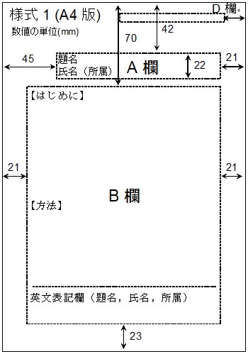 | その他の注意 | 図表のタイトル及び内容については、日本語または英文で作成してください。実際の要旨集では約86%に縮小印刷されます。 また, 白黒で印刷されますので, カラーの使用は避けて下さい。文字・画像の網掛け等はつぶれる恐れがありますので注意して下さい。 なお, 討論会までの講演要旨集の編集期間が短いことから, 要旨の提出・郵送の期限 (4/16) の厳守へのご協力を重ねてお願いいたします。 電子メールによるファイル送付が困難な場合には、事務局までご連絡ください。 |