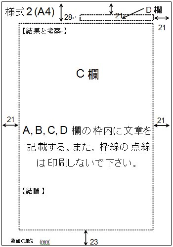 | 用紙サイズ | 縦 297 mm × 横 210mm (A4 上質紙), 余白: 様式1と2を参考に余白を設定して下さい。 |