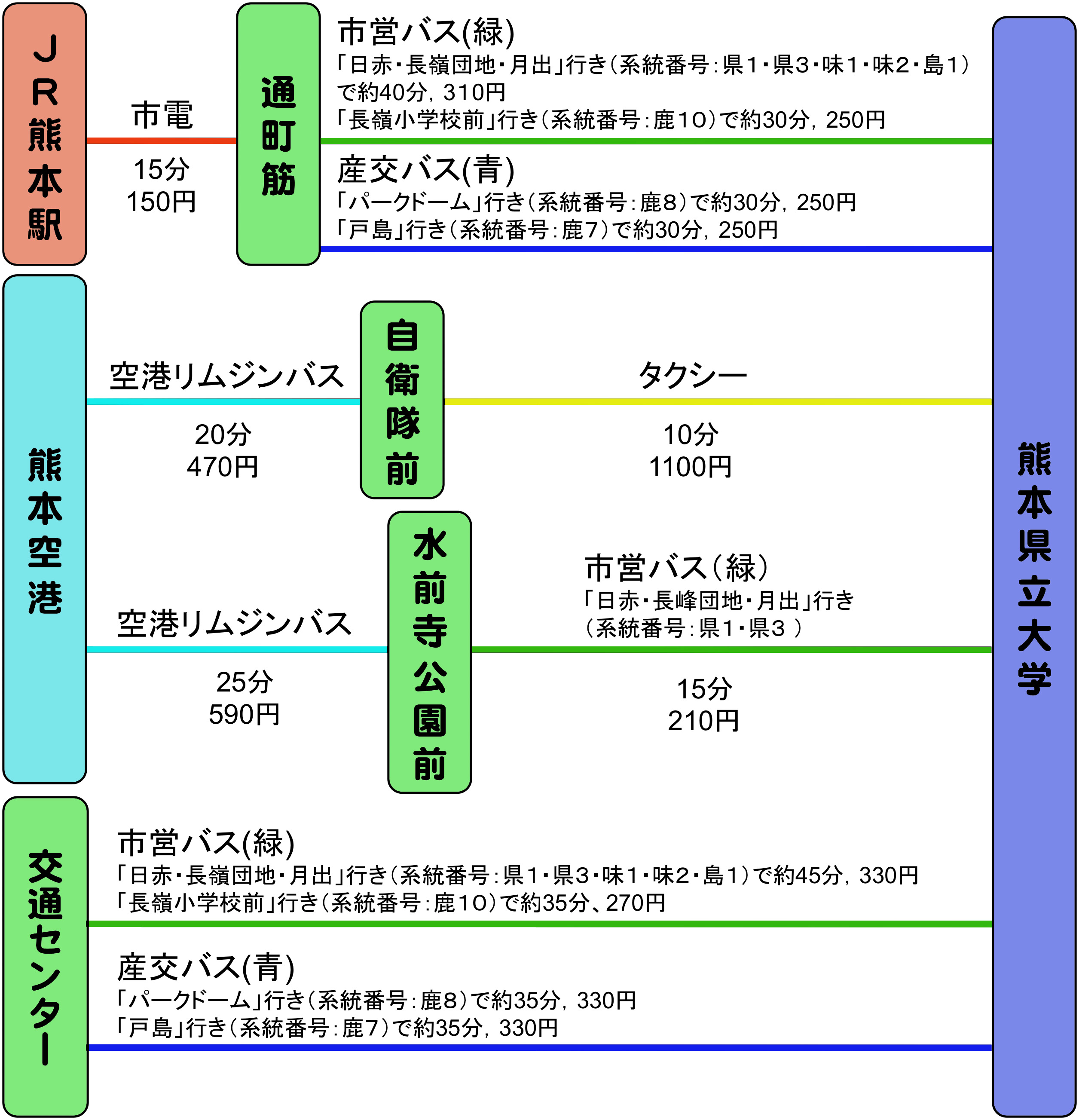 (2)「熊本市内方面」行きの空港リムジンバスで約25分、「水前寺公園前」下車。徒歩すぐ道向いのバス停から市営バス「日赤・長嶺団地・月出」行き(系統番号:県1・県3)で約15分、 「県立大通り」下車、県立大西門まで徒歩1分。