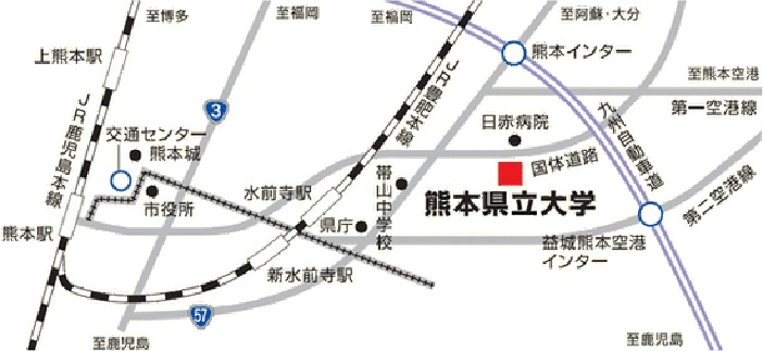 熊本I.C.から国道57号線(東バイパス)を熊本市街方面に約4km南下し、国体道路・産業道路との交差点信号(左角に「洋服の青山」)を左折。 その後、約1.5 km直進し、6つ目の信号右手(左手に「熊本赤十字病院」)に熊本県立大学。