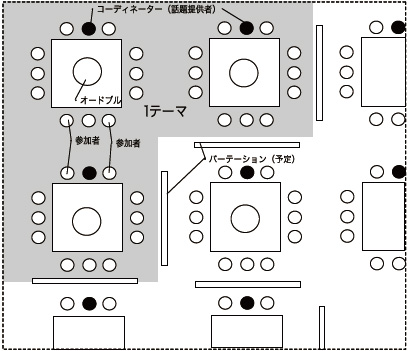 各テーブルには分野毎に選出されたコーディネーター(話題提供者)を原則1名ずつ置き、小グループでの討議を行います。
