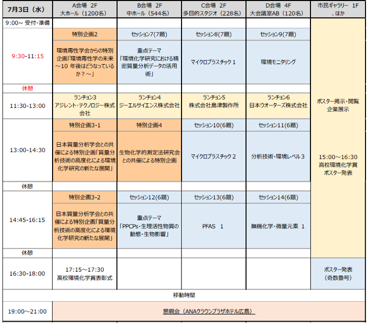 「質量分析技術の高度化による環境化学研究の新たな展開」 日時:7月3日 13:00~14:30、14:45~16:15 特別企画4 生物化学的測定法研究会との共催による特別企画